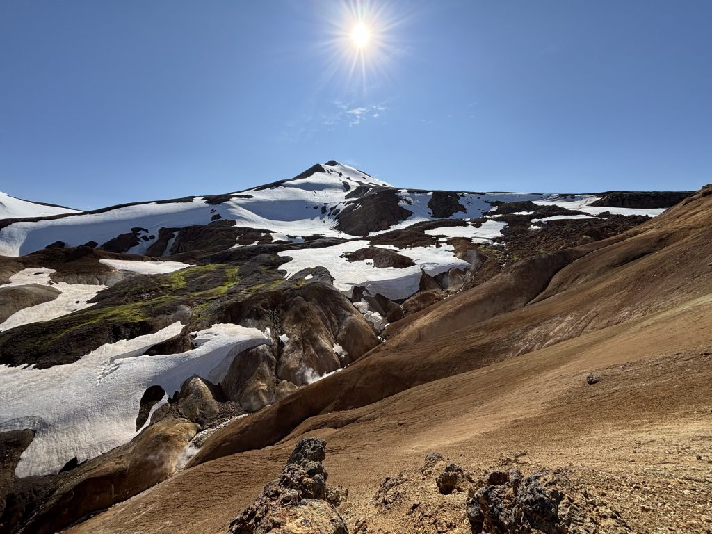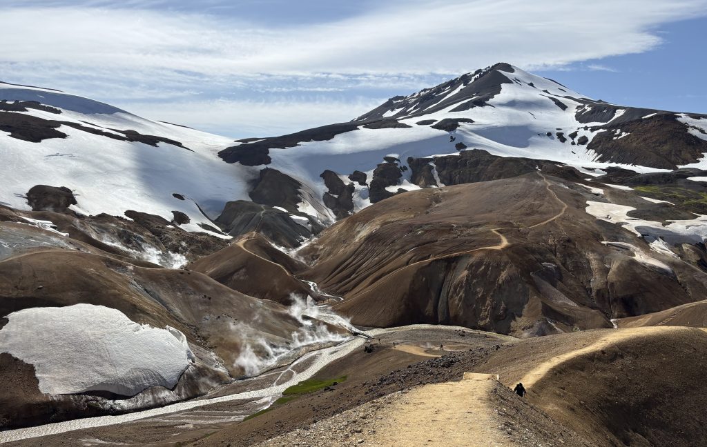 The area is full of geothermal vents, mud pools, and colorful mineral deposits. Glaciers are still aren’t too far. Here, summer snowfields and steaming valleys often sit side by side, creating a landscape found almost nowhere else.