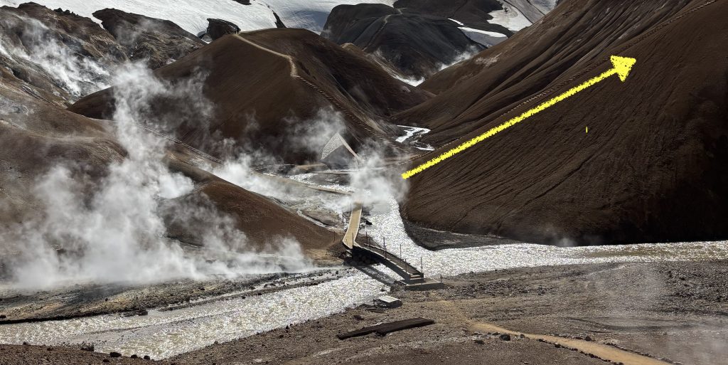 For the planning a day trip, you should focus on trail F, the Hveradalir Circle or Hveradalahringur in Icelandic. This trail covers the best of Kerlingarfjoll: the steaming mud pools, striging red peaks, glaciers, and summer snow.