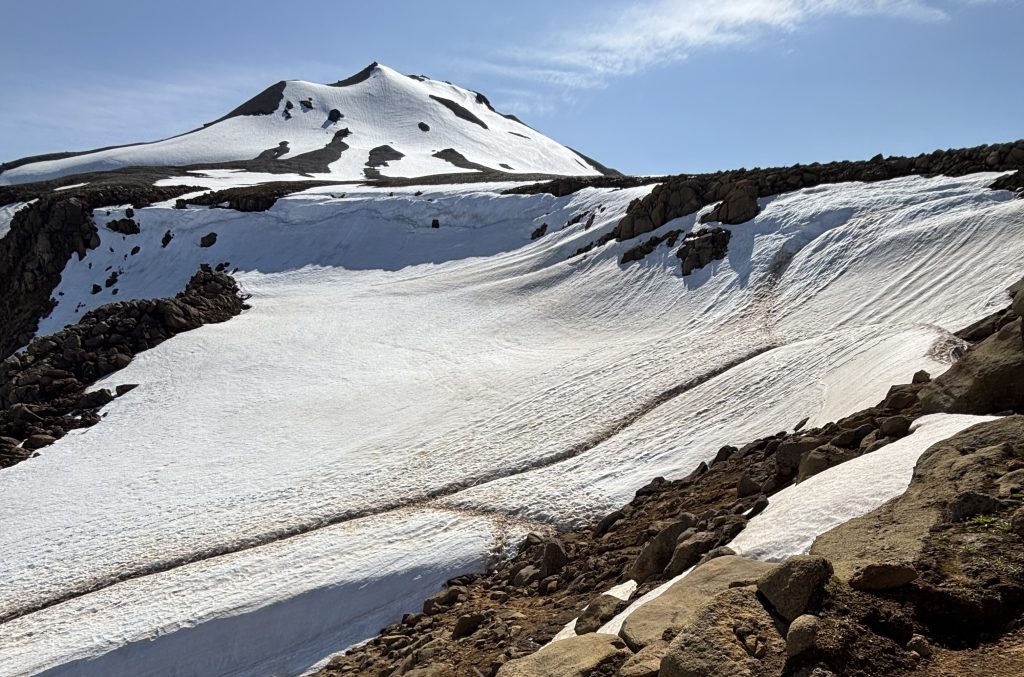 The hardest part was getting out of the snowfield. The tracks diverged and disappeared as snow melted and mixed with dirt. We scrambled up some lava and that was probably the wrong path. But eventually we found the track, which again became very obvious.
